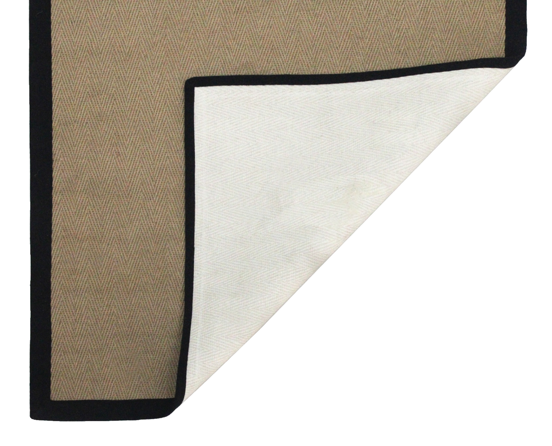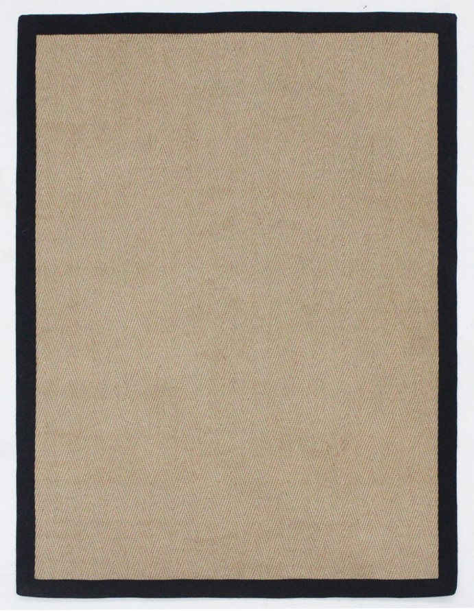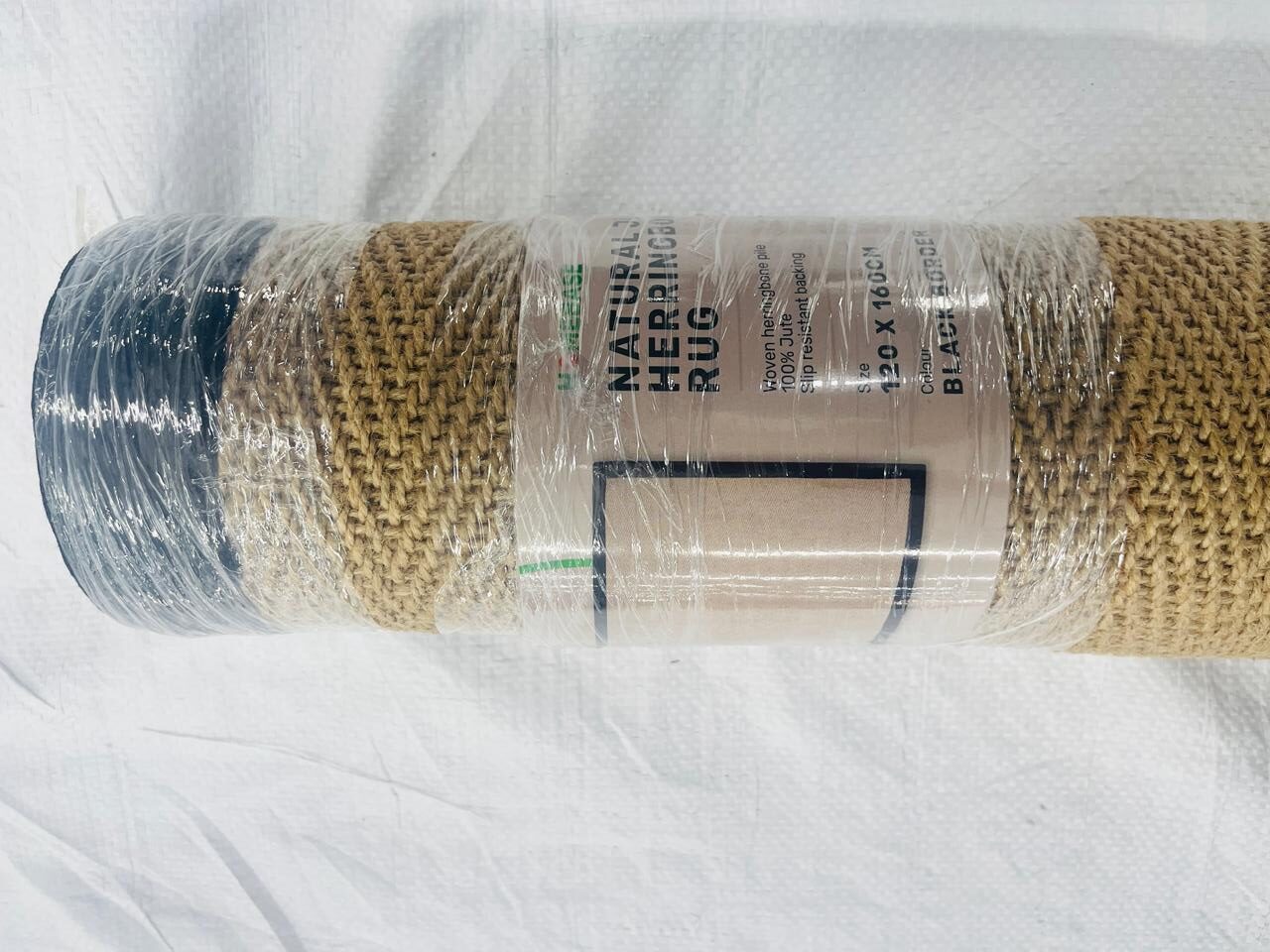 Jute Rug with Rubber Backing. Herringbone Design. Black Cotton Border.