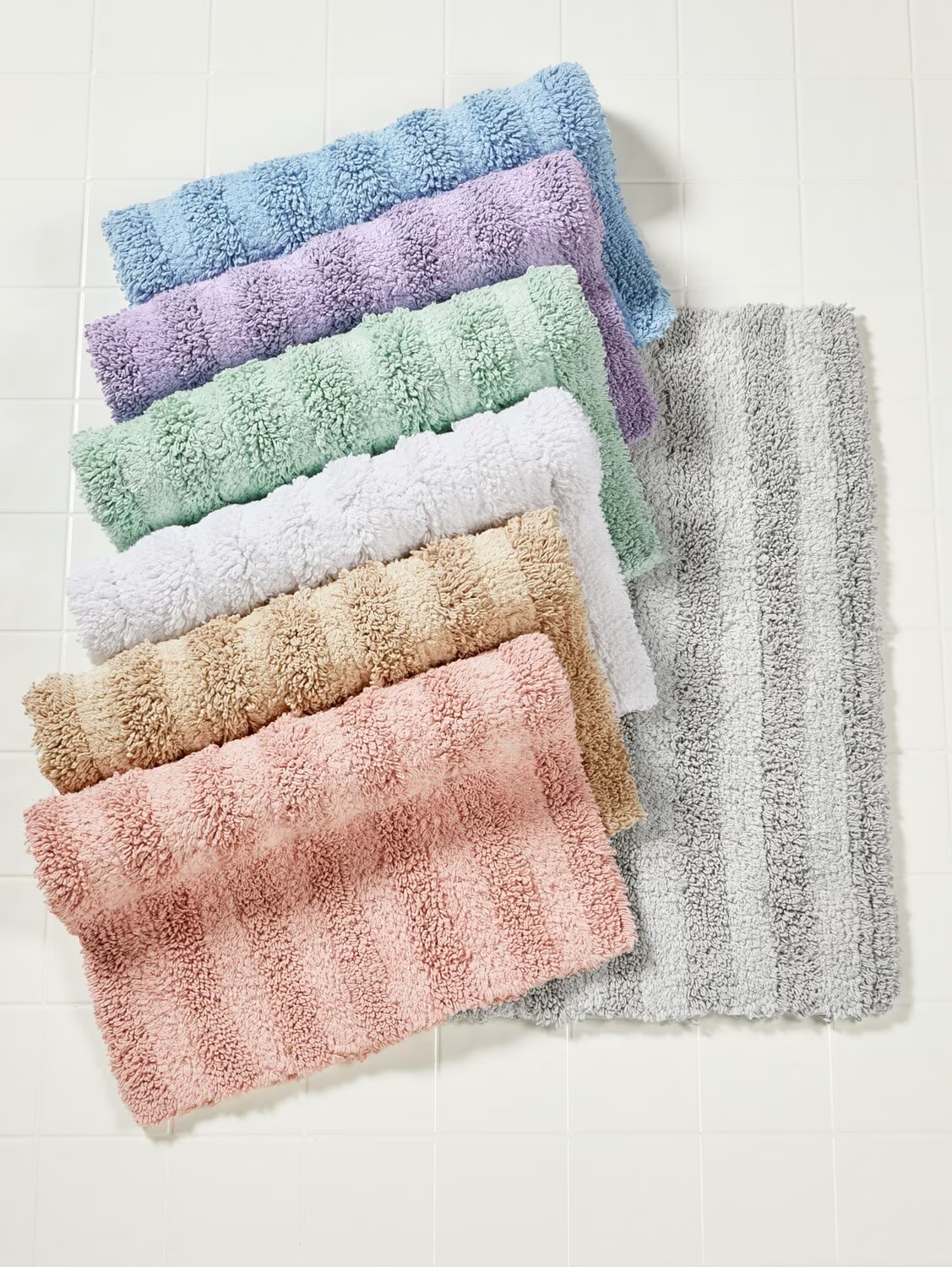 Step into comfort and luxury with our premium cotton bath mats! Crafted from 100% soft cotton, these mats provide a cozy feel underfoot, excellent absorbency, and a textured striped design that adds a touch of elegance to any bathroom. Available in a variety of soothing colors, they effortlessly blend with your décor while keeping your floors dry and safe.